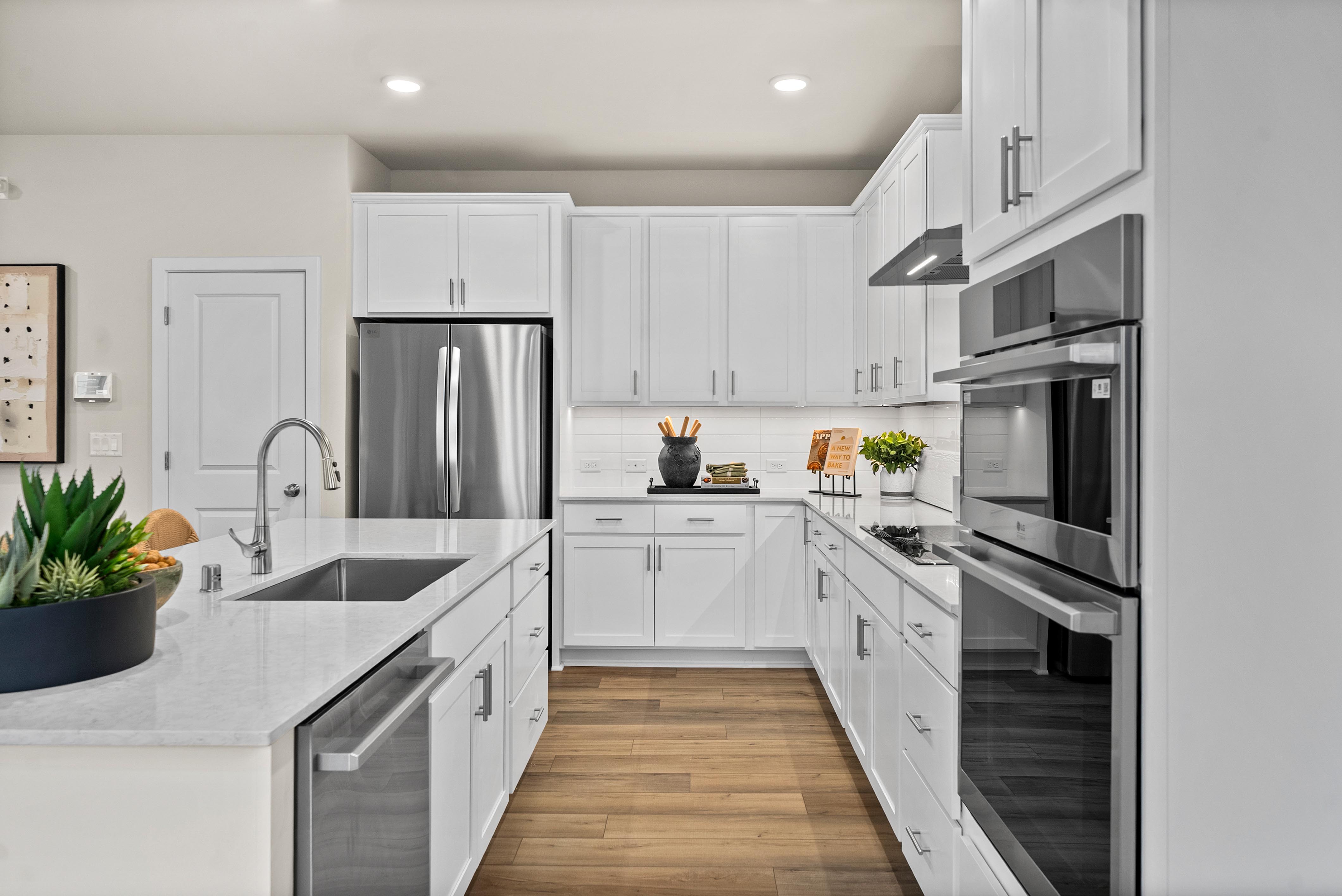 Showcasing thoughtfully designed two-story floor plans, these homes highlight modern features that blend comfort and innovation. Enjoy stylish quartz countertops in the kitchen and primary suite, premium stainless-steel appliances—including a electric cooktop with a 36” wall-mount range hood and smart Wi-Fi oven/microwave combo—plus 34.5-inch cabinets with molding, soft-close doors, pulls, and under-cabinet lighting.